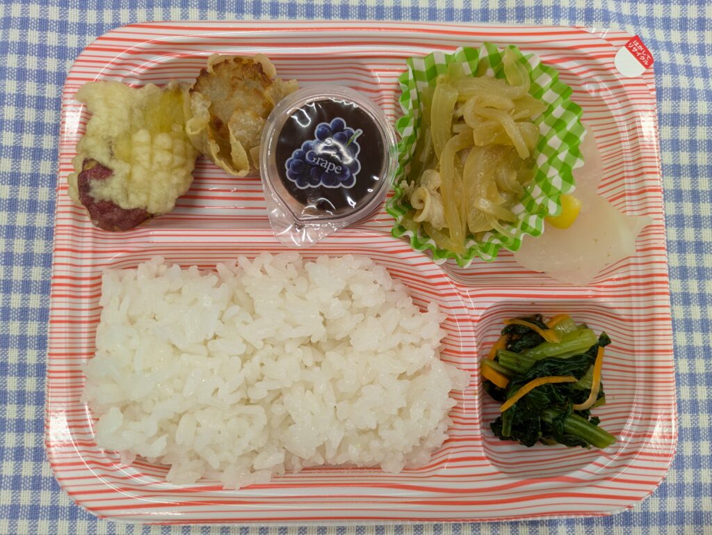 今日のメニューは、豚しょうが焼き・さつまいも天・大根マリネ・青葉いそ海苔和え・シューマイ・ゼリーでした♪